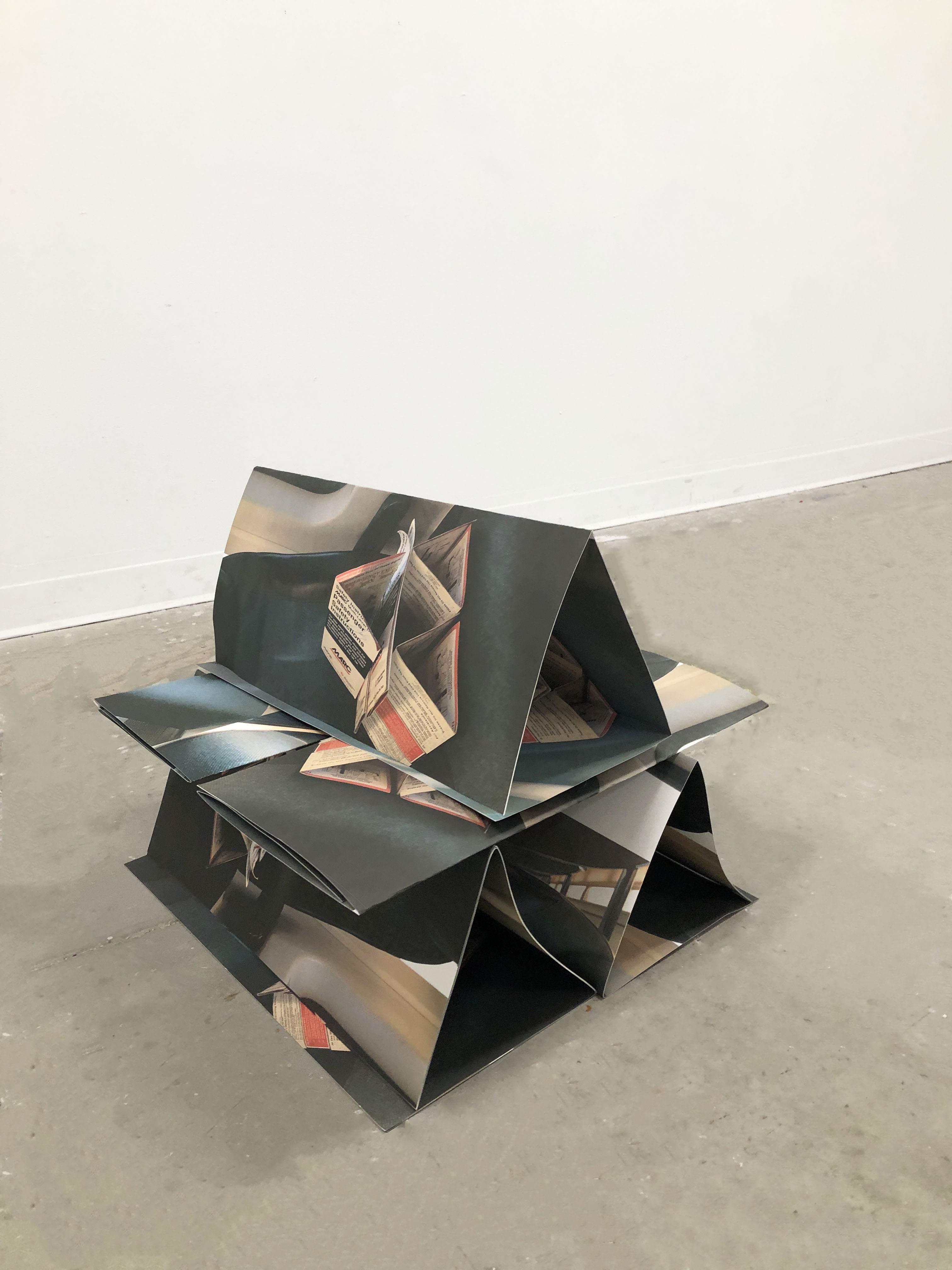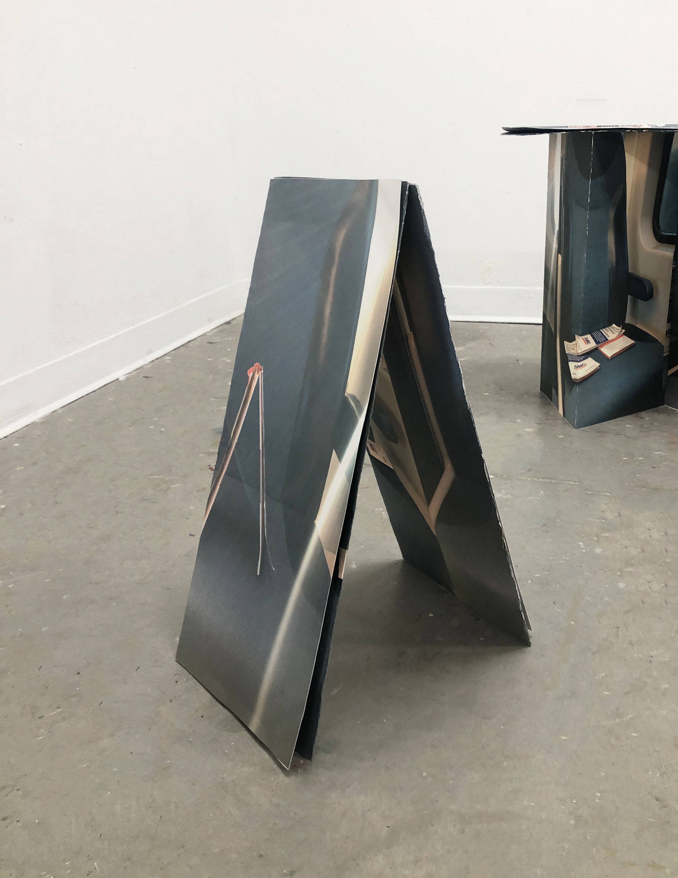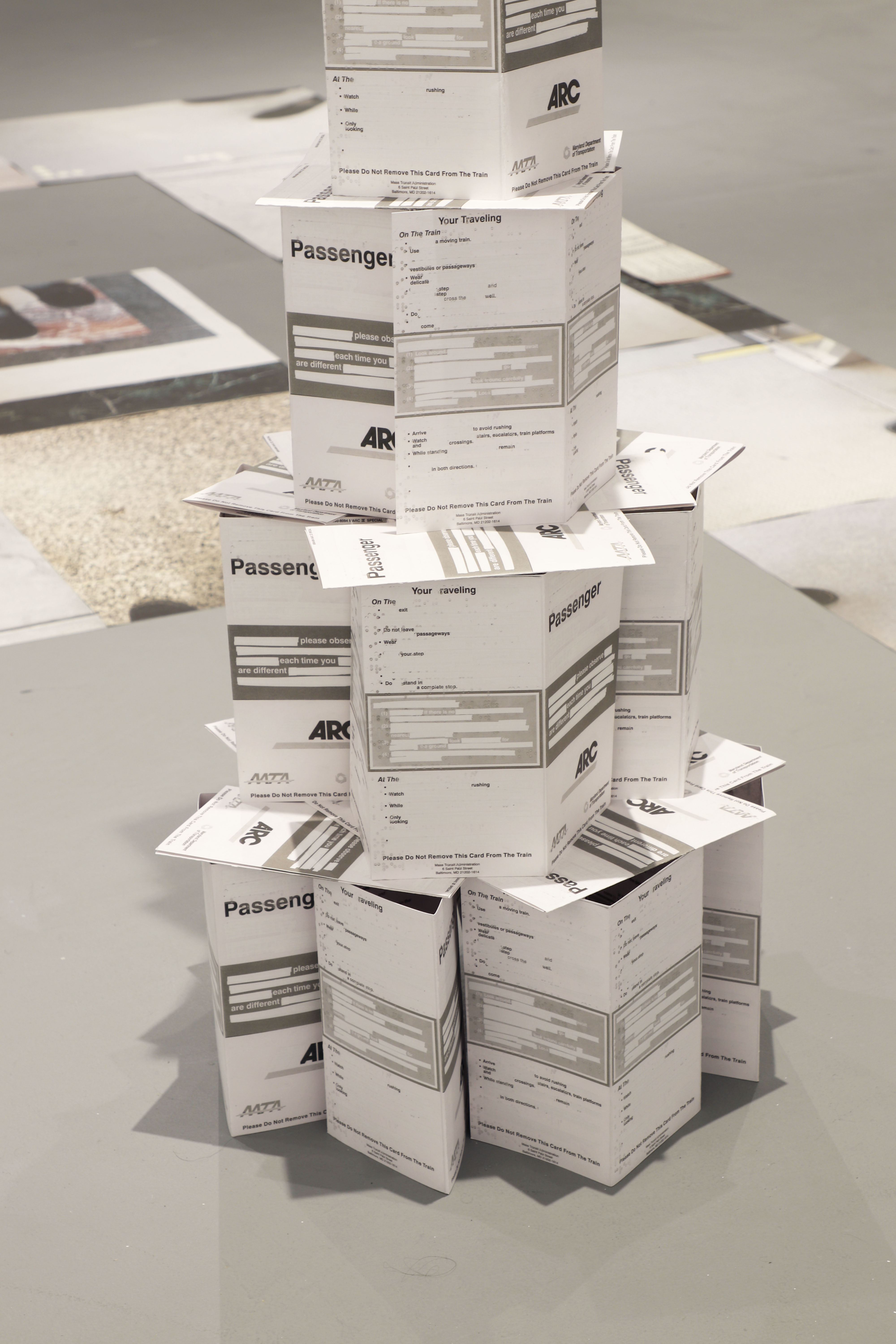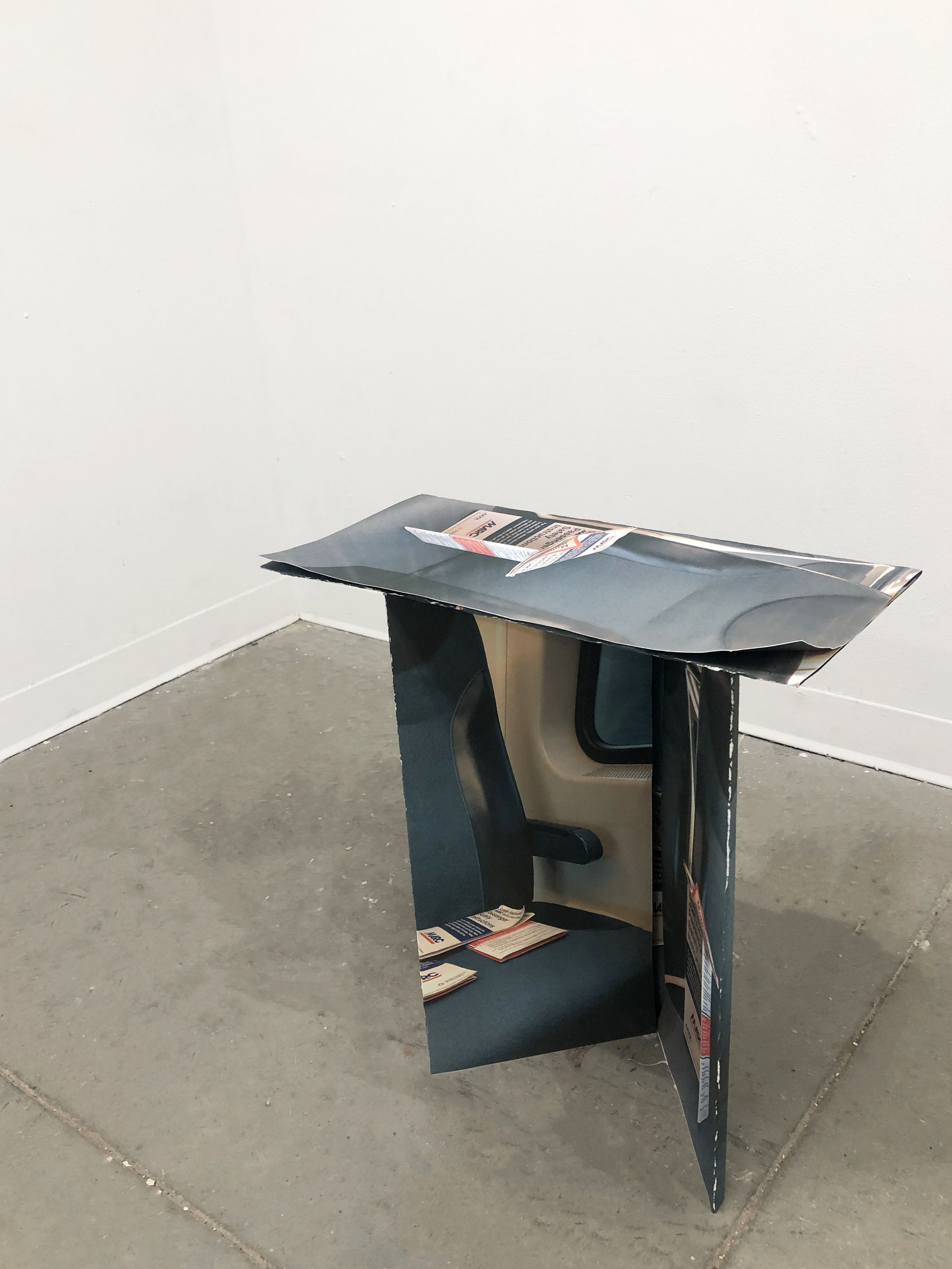 Knowing there would be no way to transport them fully outside their moment, their precarious placings, their rickety richness, their wavering walls. There still was the desire to capture, record, transmute, and ferry them into other physicalities. So, I snapped some pics with my phone and then printed them out and attempted to recreate the forms they were depicting. And even though they depicted a recorded and removed moment, they still relied on being make-shift and temporary and could collapse at any time as they could on the train. Was this a way to make the photograph “wholly manifest” and “self-sufficient”? I think the answer is still no, but I’m ok with that. Being haunted by wholeness and self-sufficencies, is how it feels to be a person, a body, which are little words for saying: a temporary being. Why try to push against that? Instead, it is better to sway, teeter and stay “wholly un-manifest”, an unruly object.