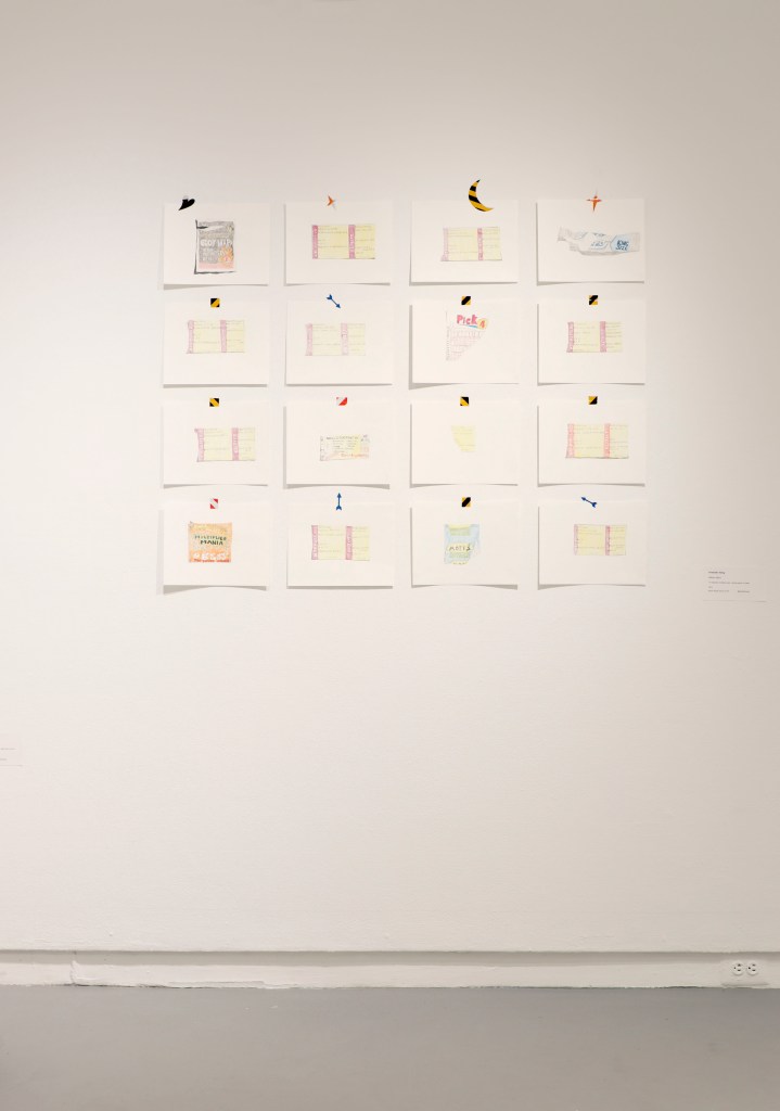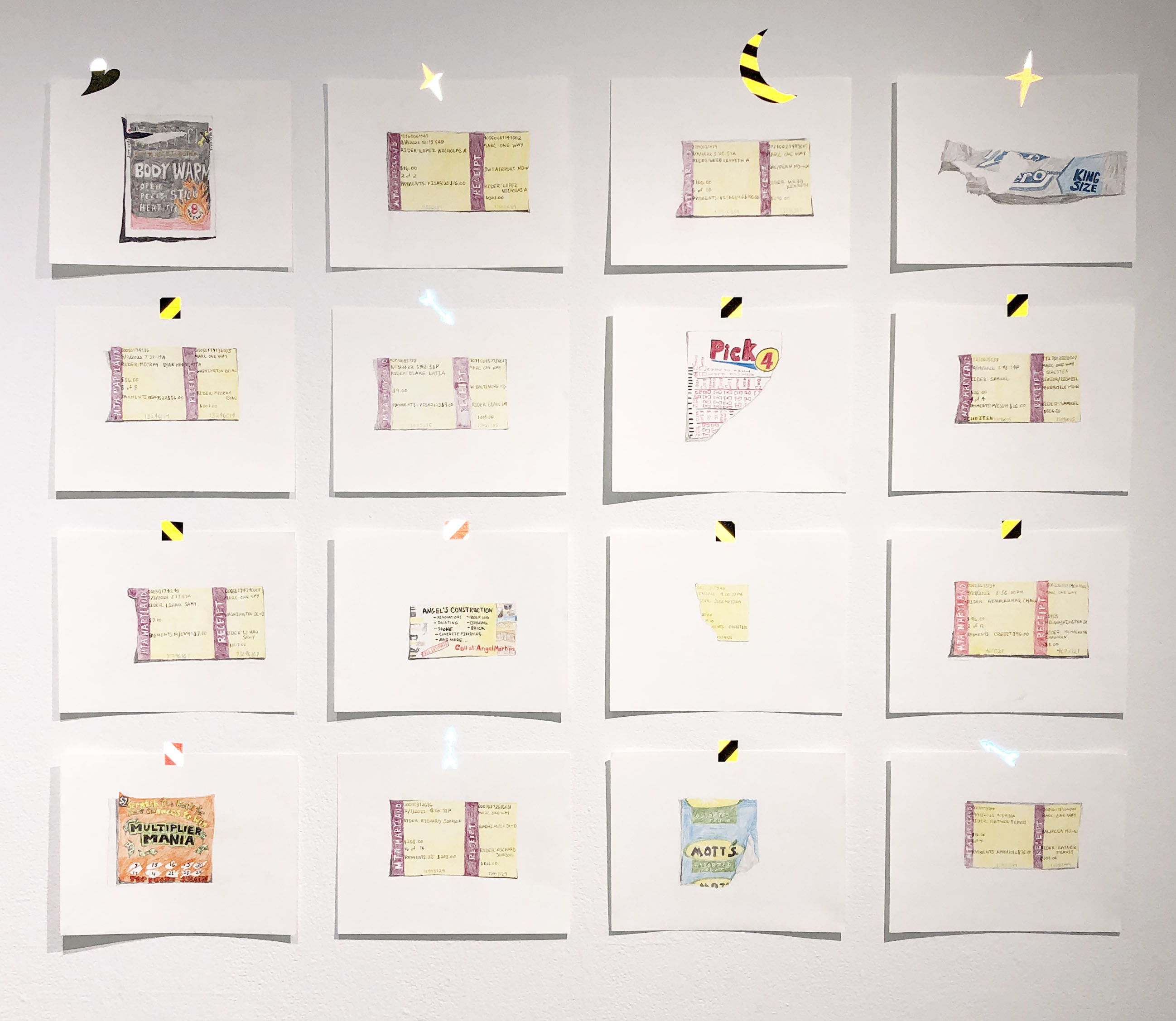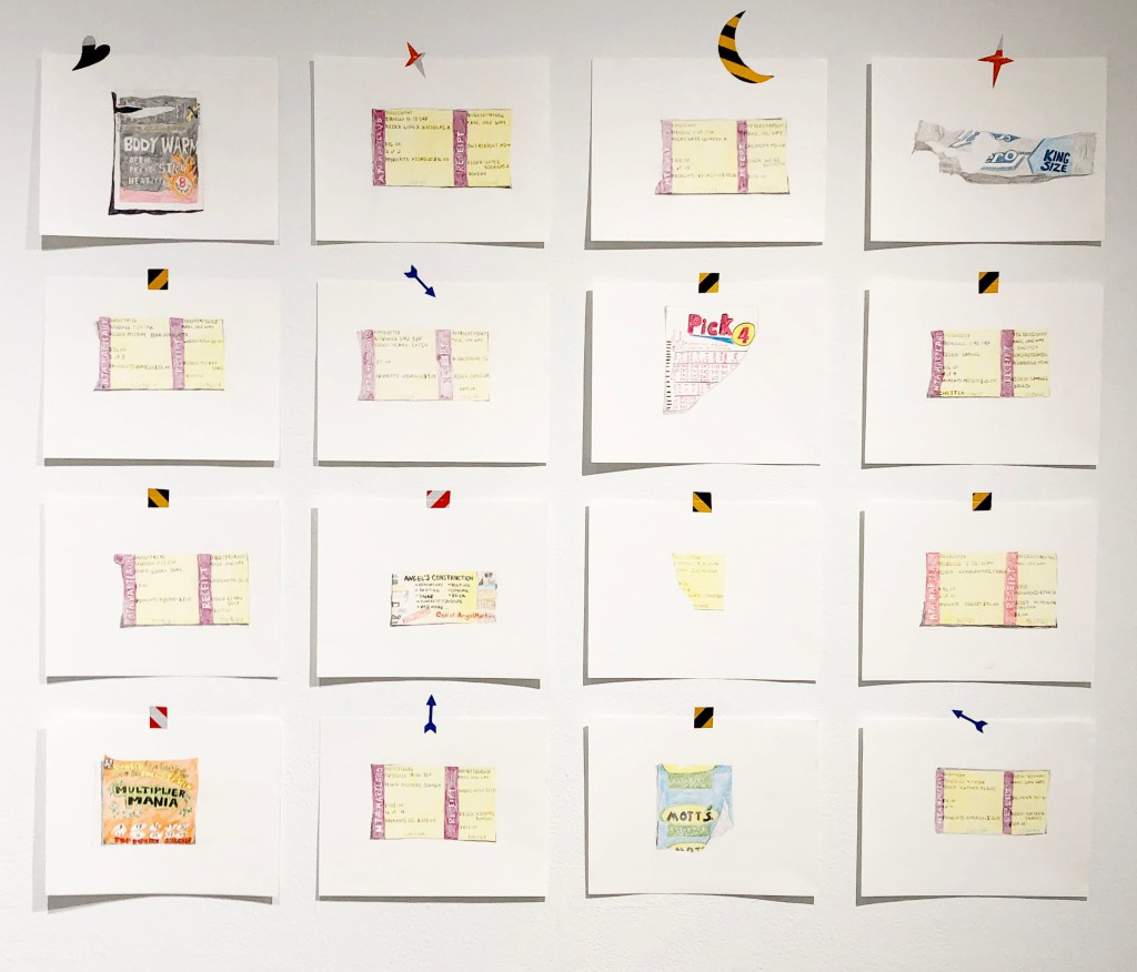 Going from monumental spiral to mass-produced discarded trash. Back on the commute, it is hard to strike up a conversation with my fellow riders, everyone is tired, exhausted, rushed, wary, suspicion of their surroundings. If you see something say something, ringing in the ear and into the body, becoming eerie muscle memory. So, I went searching for my fellow riders in another way. I started collecting the hidden trash in the nooks and crannies of the seats and aisles. And after amassing a few hundred pieces, I could see the commonalities emerge, of lotto tickets, candy wrappers and other ways of temporarily soothing the body, such as heat and ice pads for all the fleshy pain of the commute.