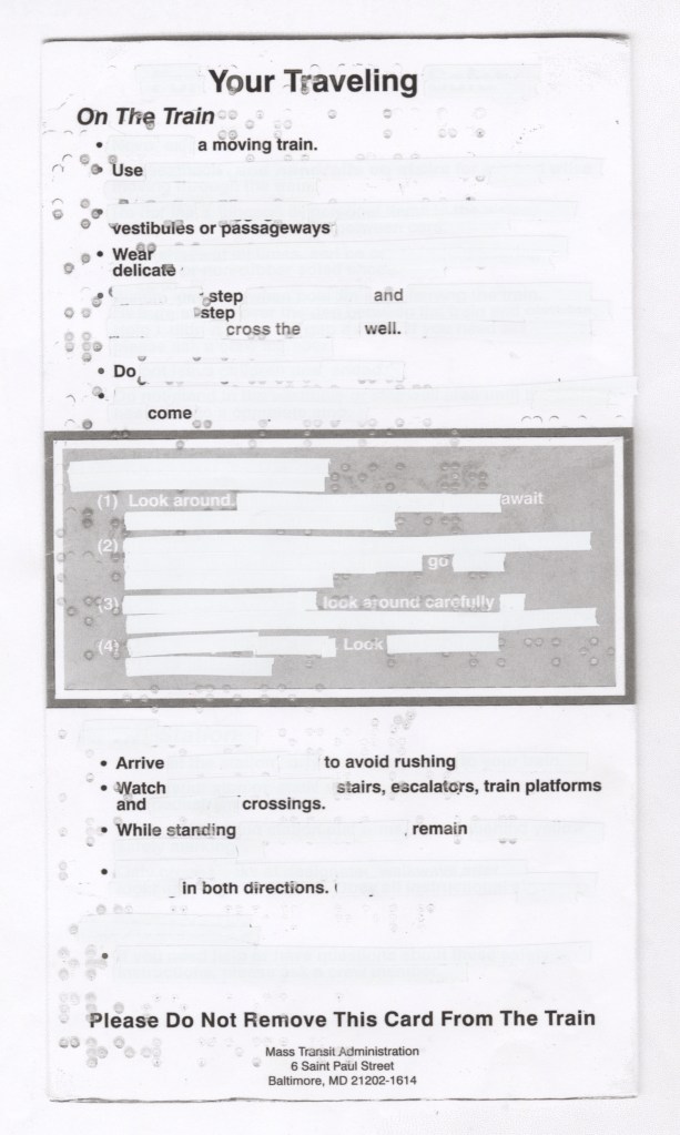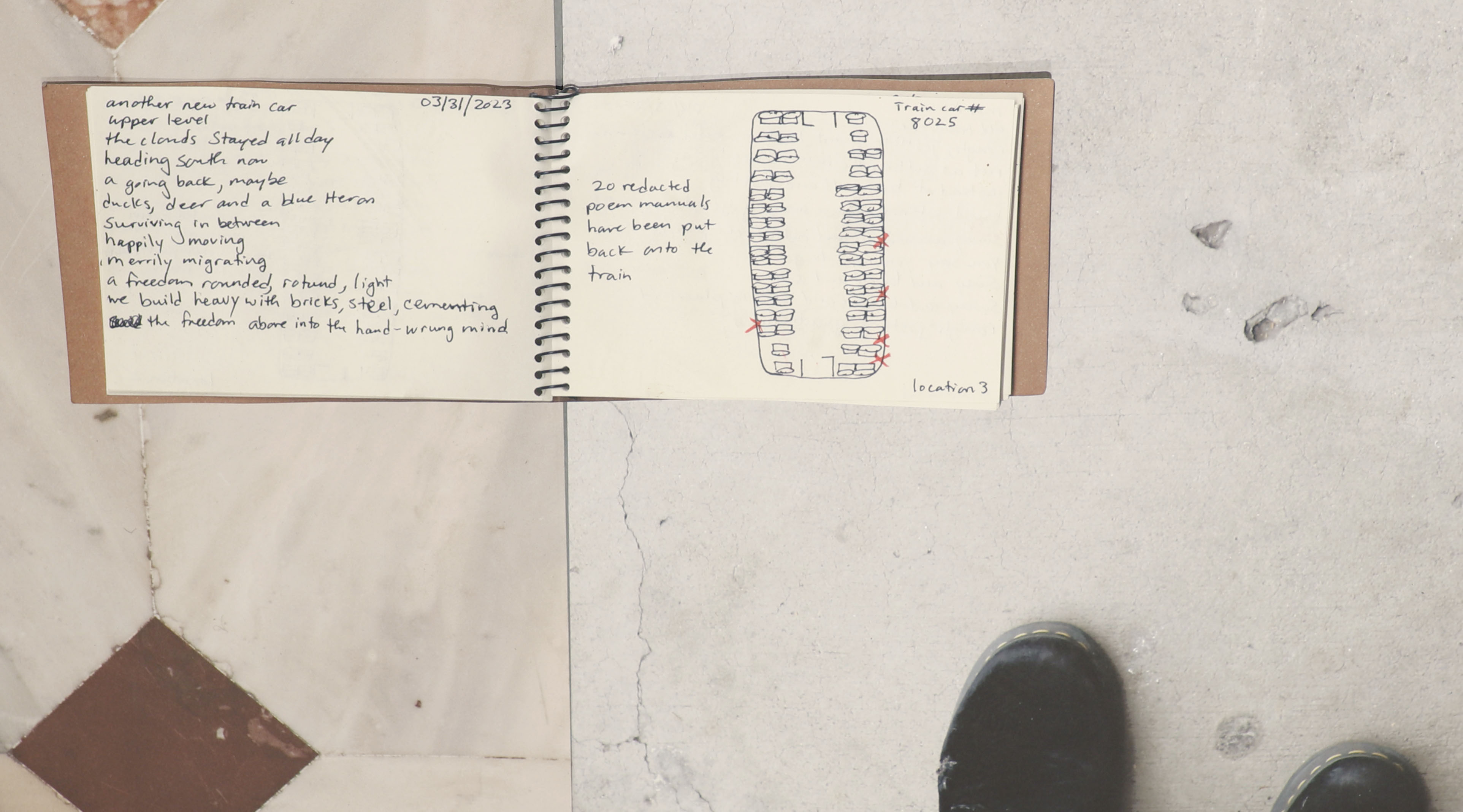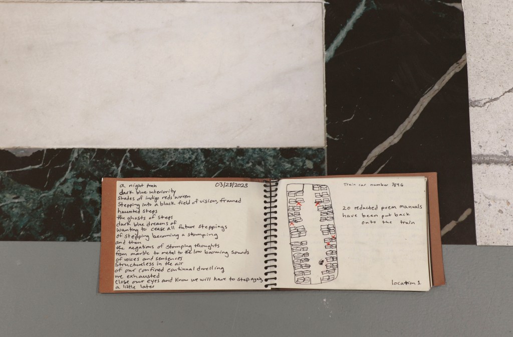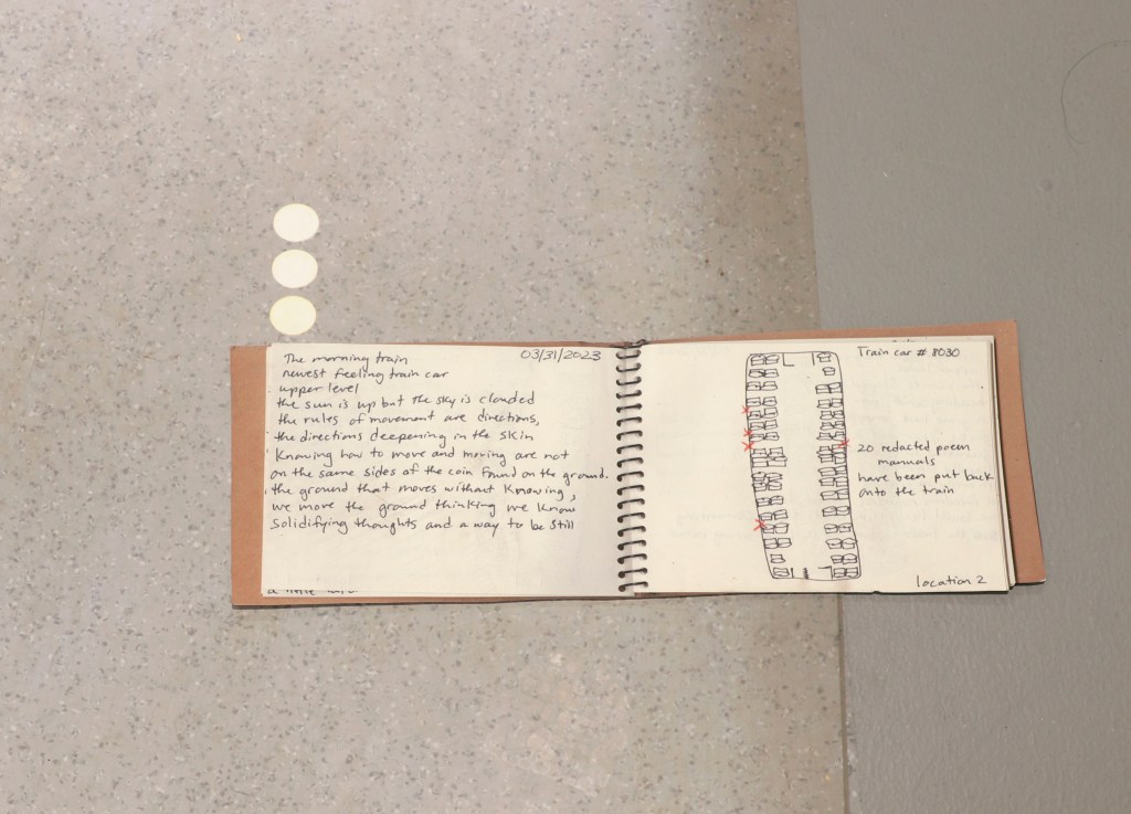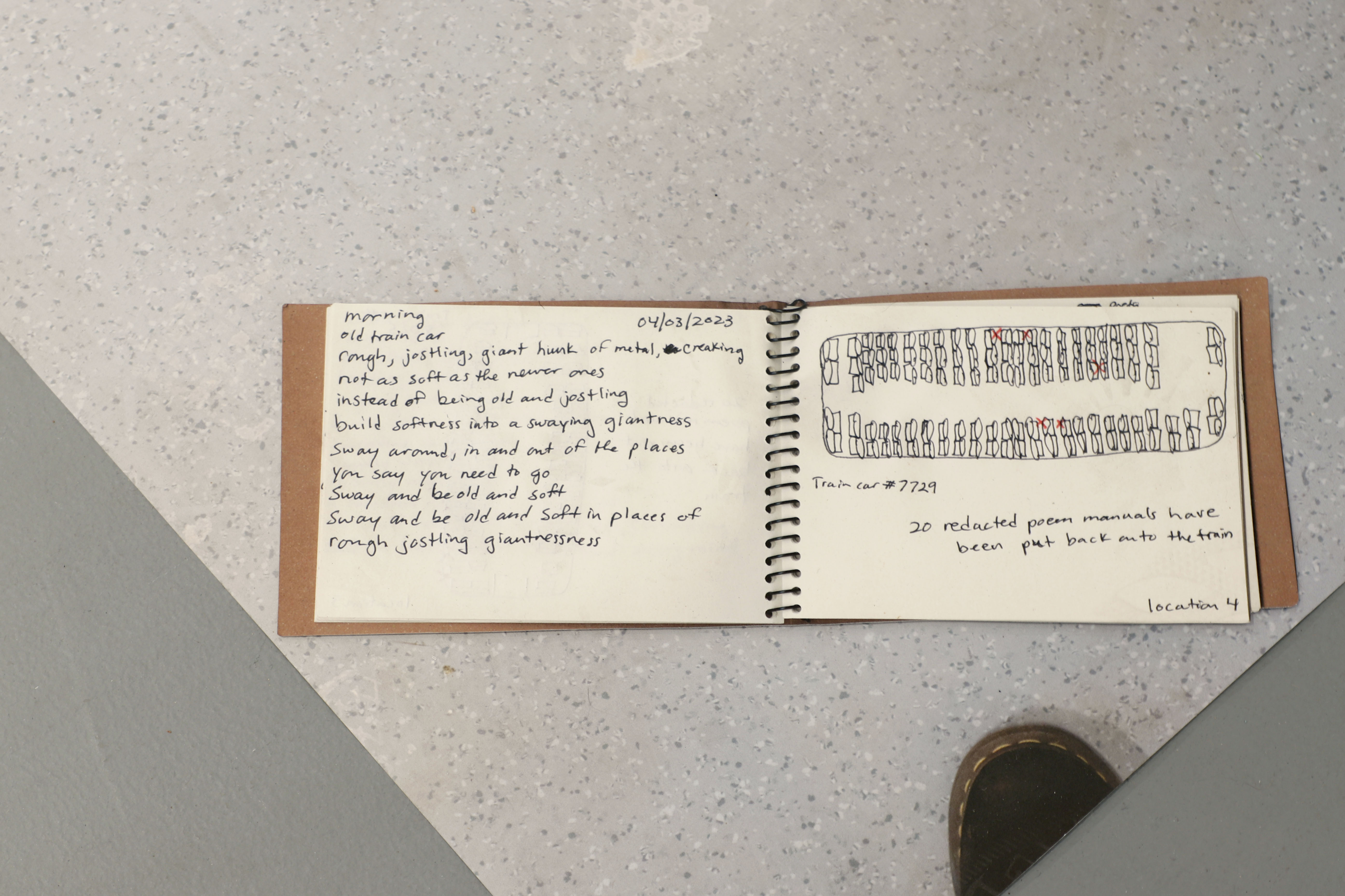 Presented in the gallery as maps and poems describing their re-placings, along with train car numbers so as to provide the ability for gallery goers to perhaps seek them out, happen upon them or even to notify the Marc train of their whereabouts in order to “rat me out”.