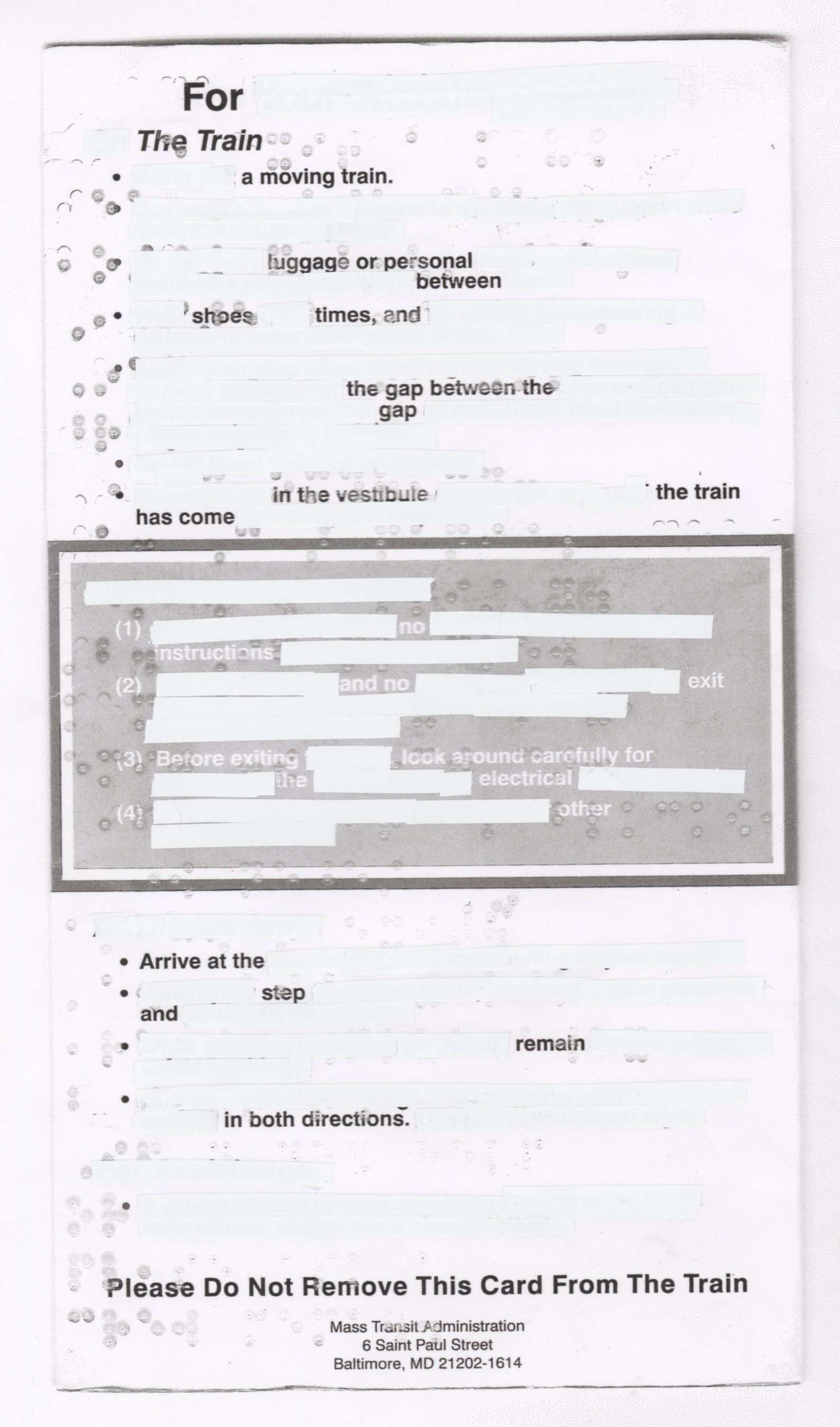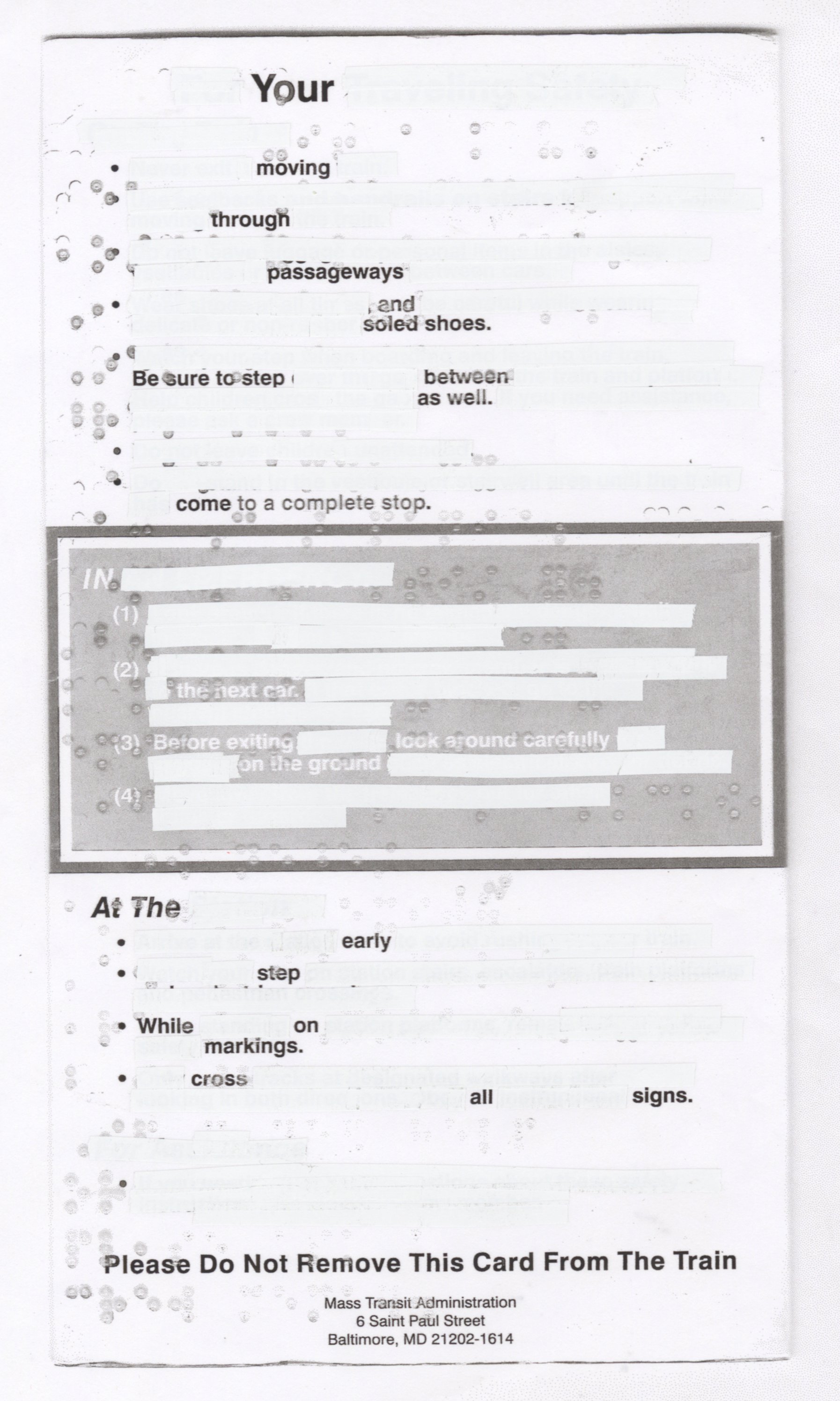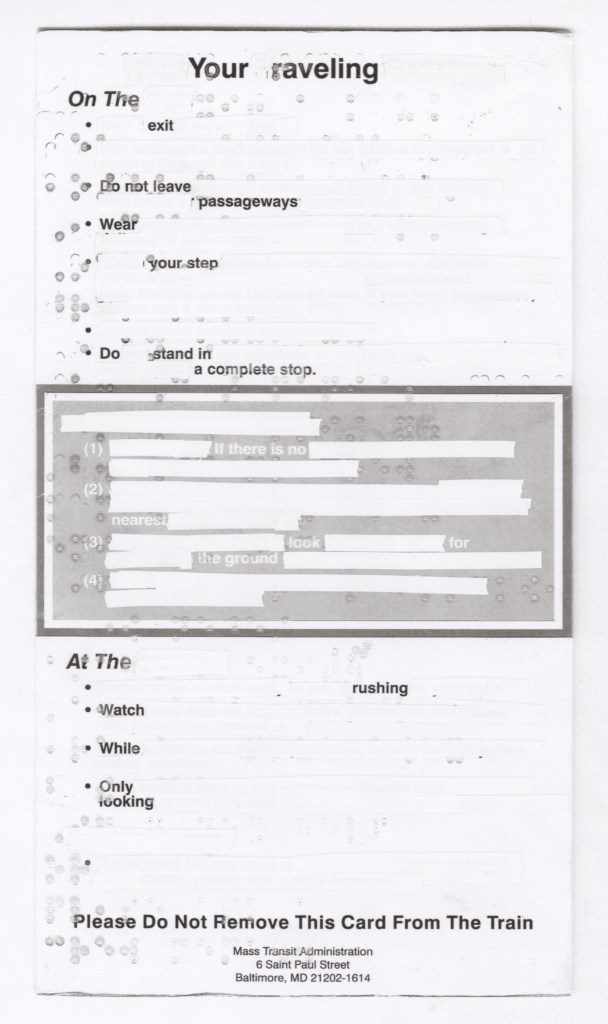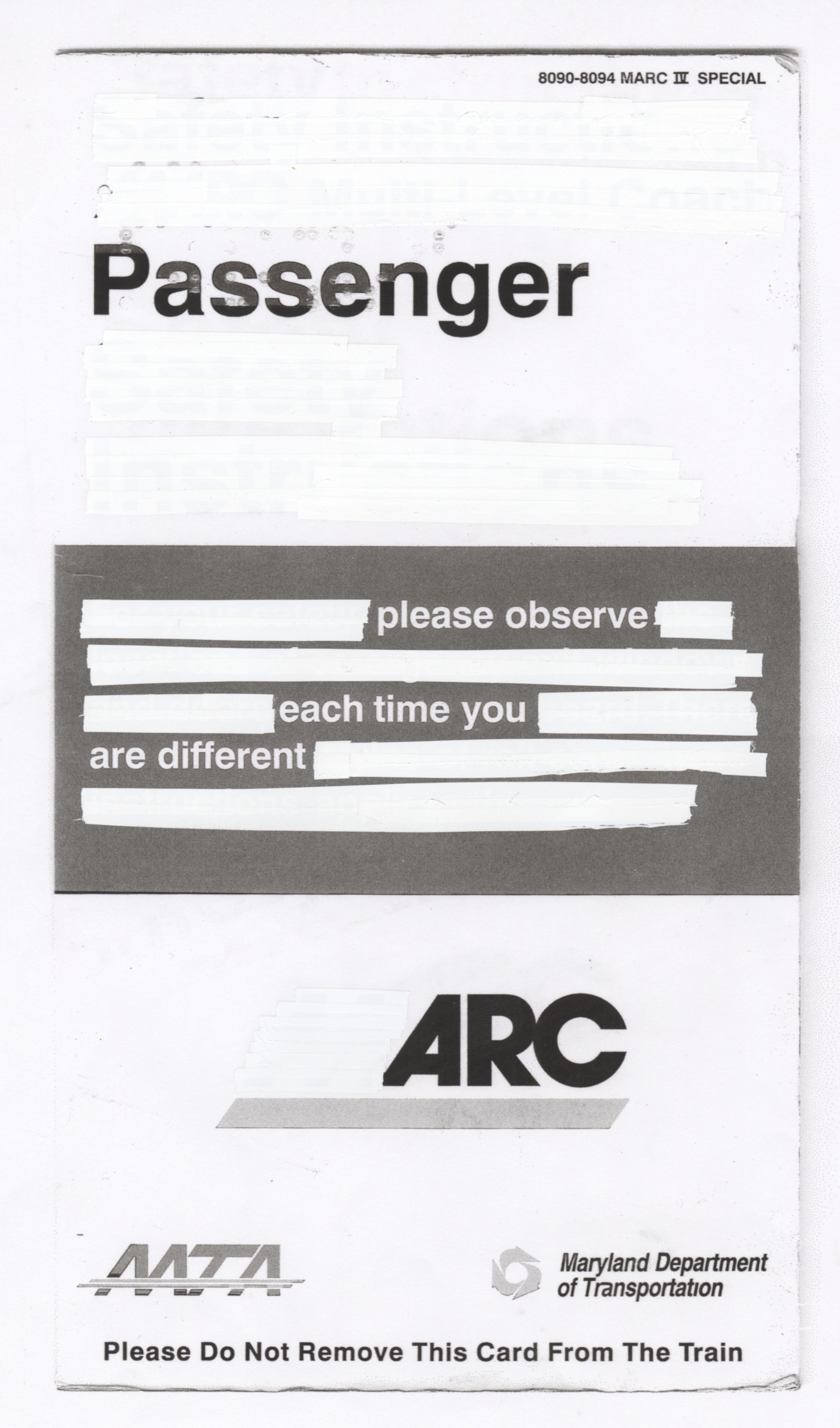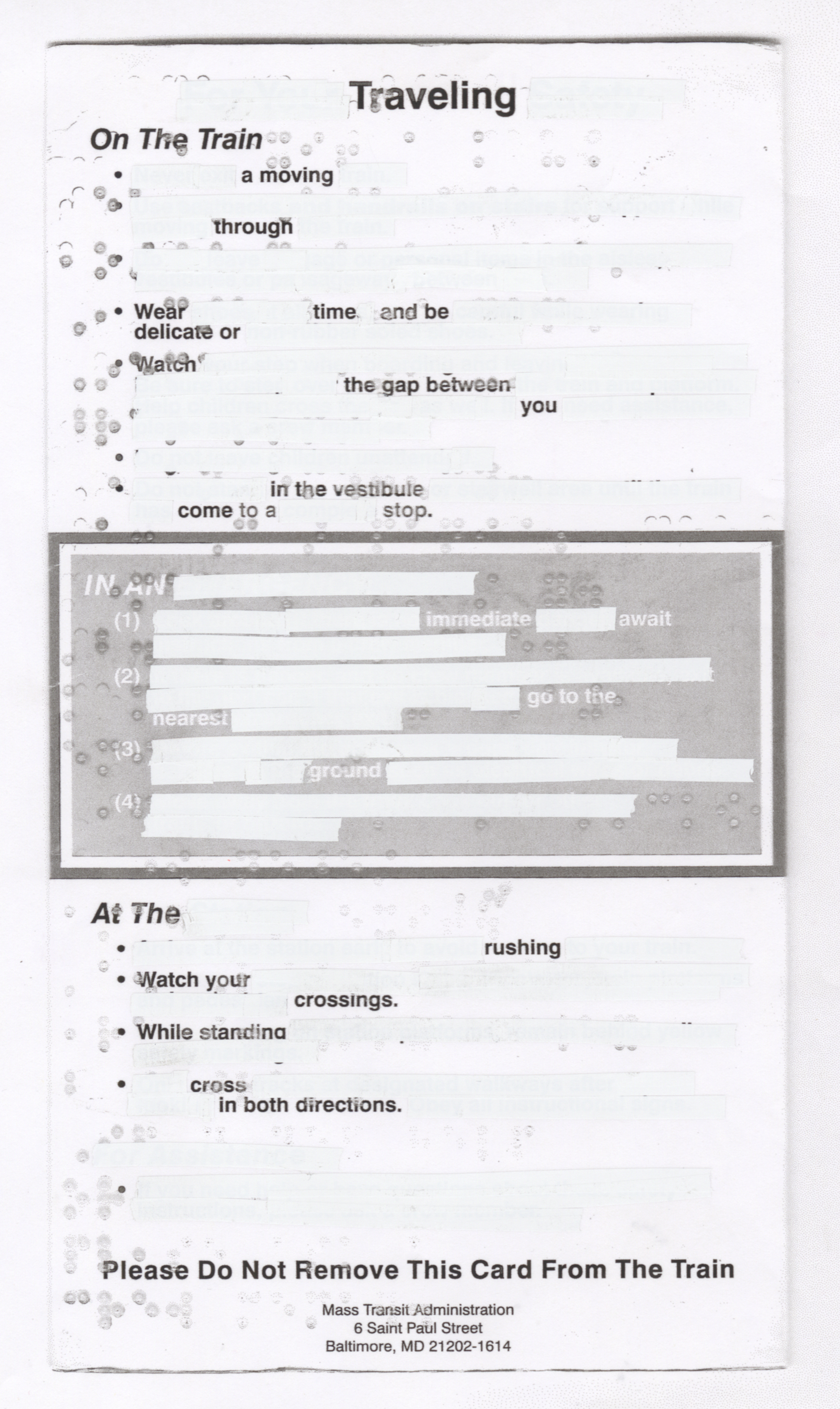 Presented in the gallery as maps and poems describing their re-placings, along with train car numbers so as to provide the ability for gallery goers to perhaps seek them out, happen upon them or even to notify the Marc train of their whereabouts in order to “rat me out”.