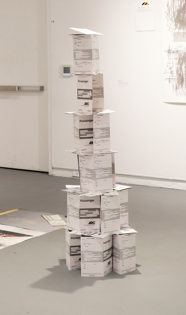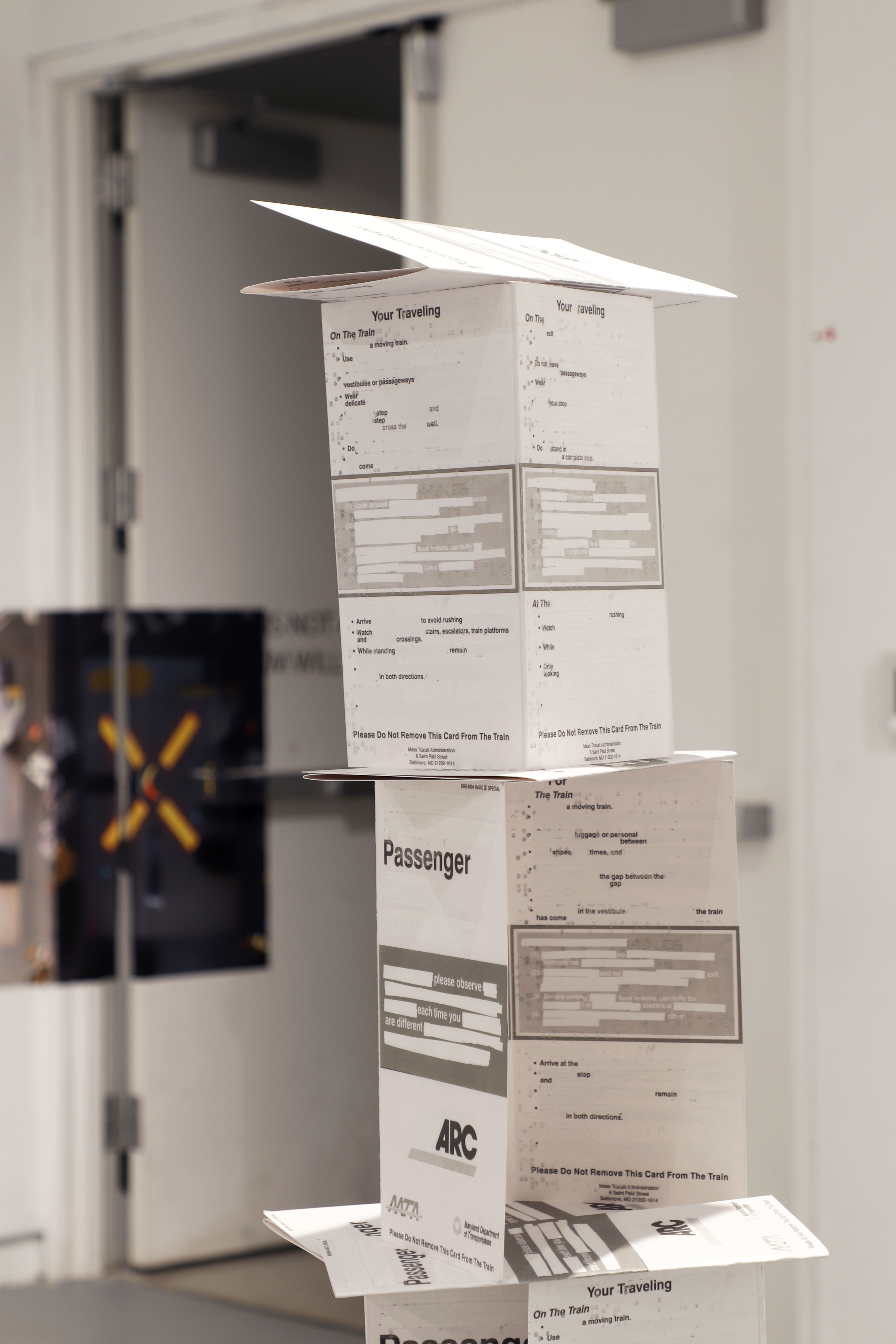 Making things up as you go along, making-shifting one’s way through time and space, in the idle moments of the ride, building silly temporary sculptures with the ubiquitous overlooked object of the safety manual pamphlets. Making them without “dwelling” on them too much, making them in the time and space of the continual dwelling of the commute.