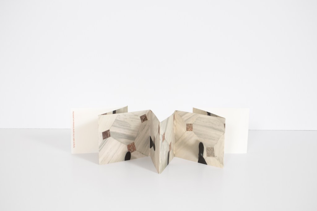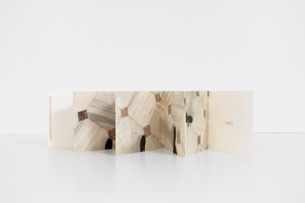 In trying to walk in the same footsteps as yesterday, a futility and absurdity reveals itself visibly. Now printed as a book, an accordion folding and unfolding, front and back reversing back into itself. No beginning and no end in sight. Perhaps we could try our hand at creating new paths? Ones that step more lightly into time, into being here with one another now?