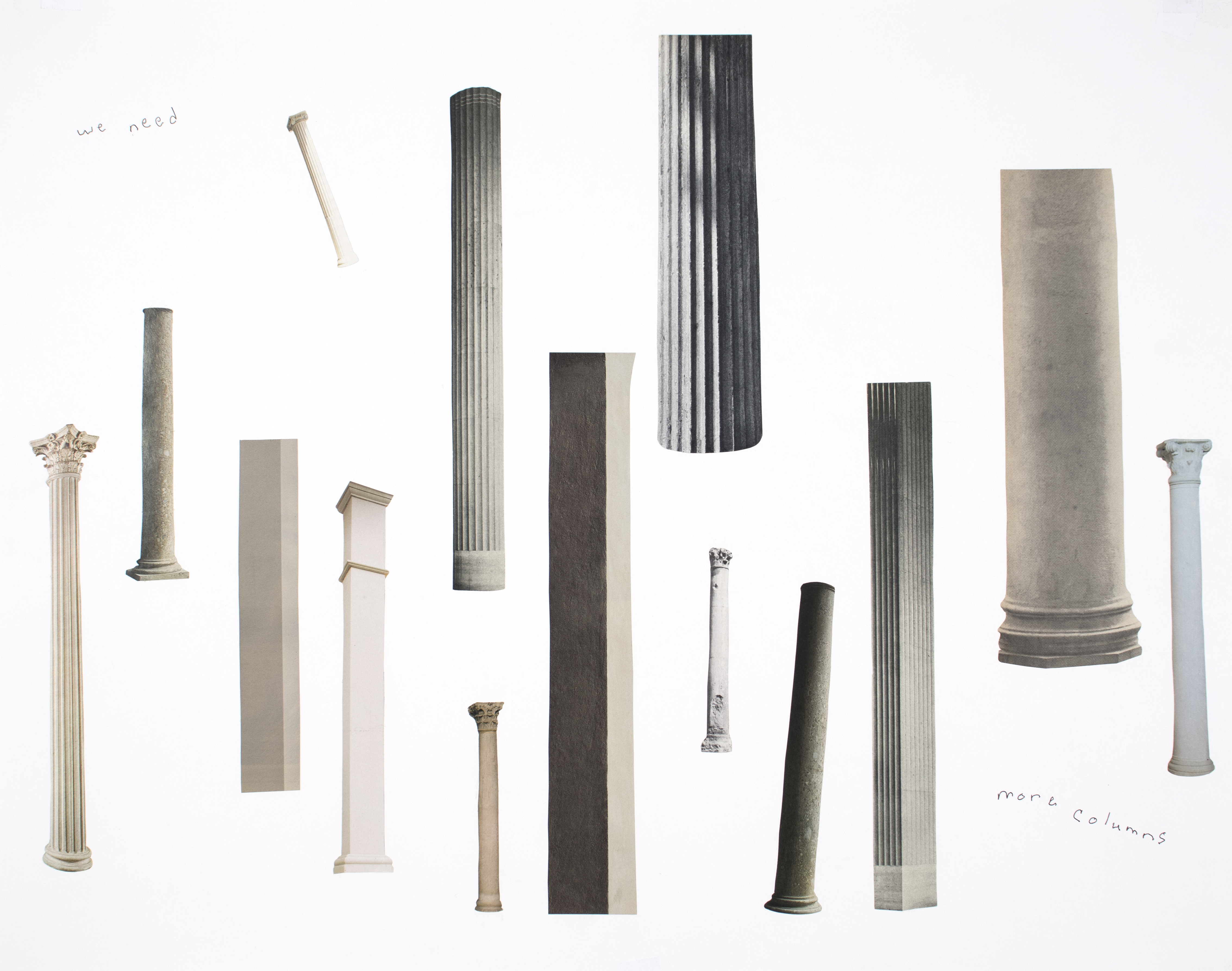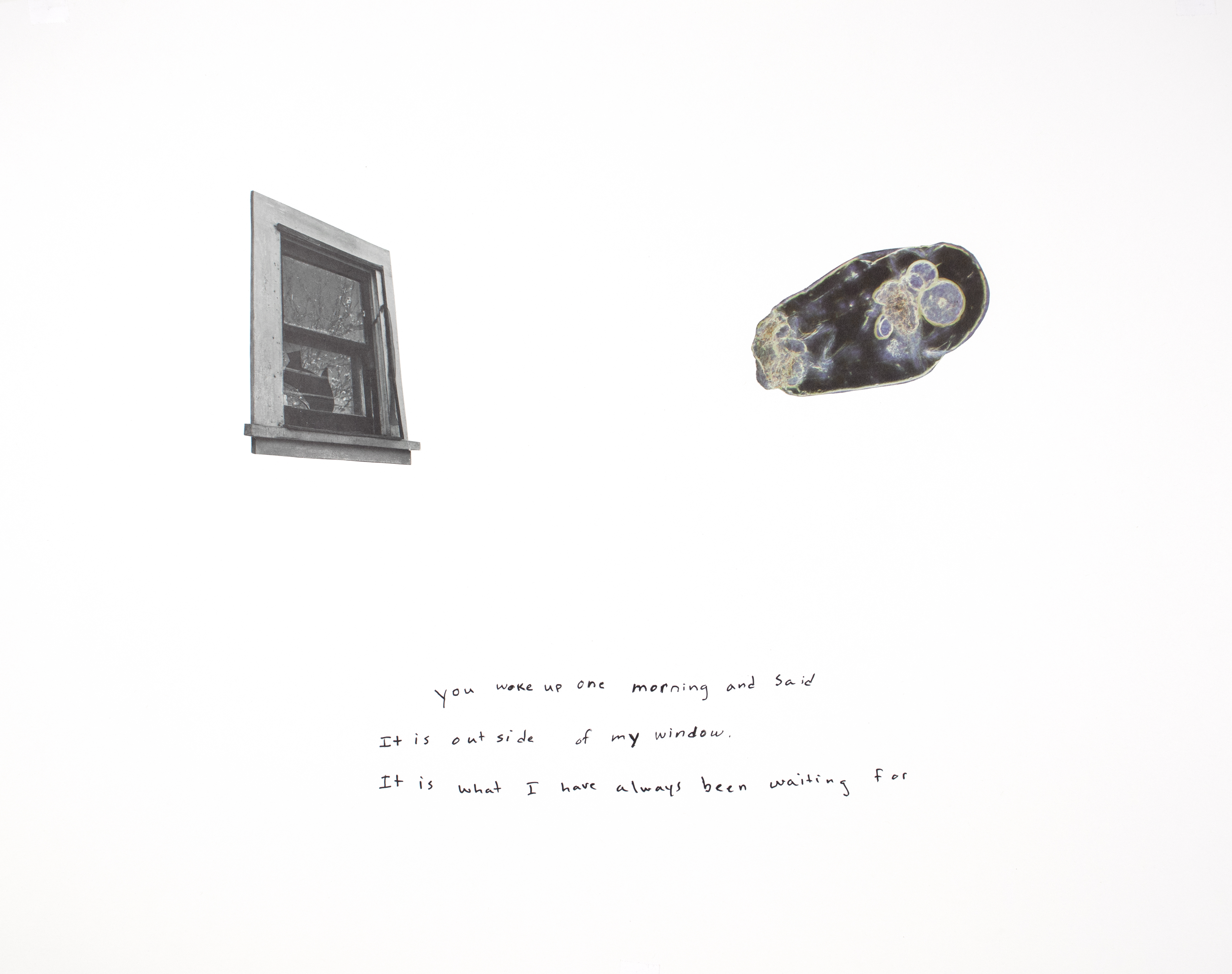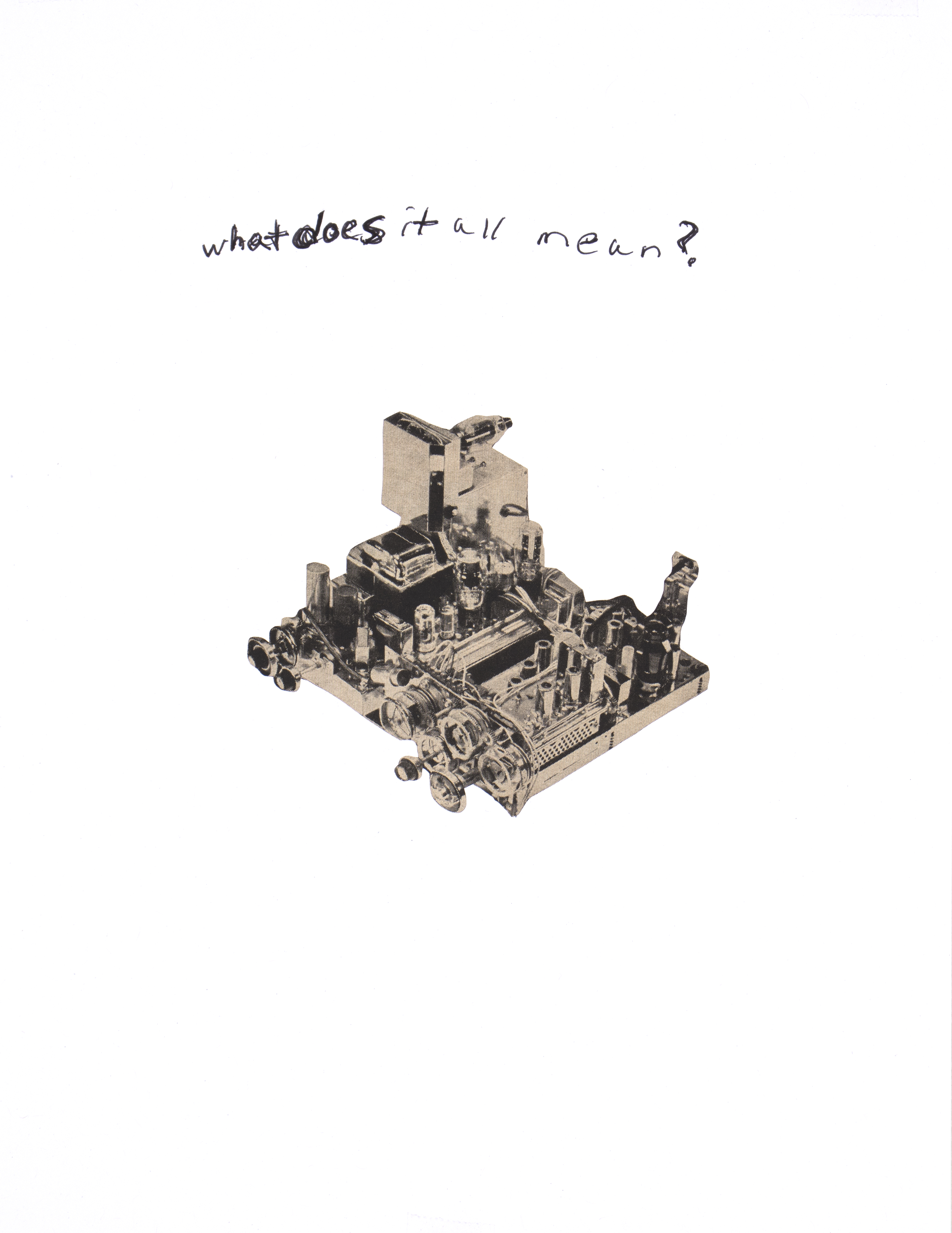 Quick! One Last Poem Before I Go Off, My Rocker…, which I’ve stolen from the beginning of a poem by Frank O’Hara in his collection of Lunch poems, that he wrote on his lunch breaks while working at MoMa, are a continuing series of collages that I make in the “off” hours of the day, or late at night after the day’s obligations are done. They are made quickly with the idea of letting the mind process all the sounds, words, headlines, sightings, anxieties, daydreams, illusions, and confusions of the moment and at the same time trying to play with the underlying structures of how it is we make the world around us in all our descriptions and renderings of it in the mind.